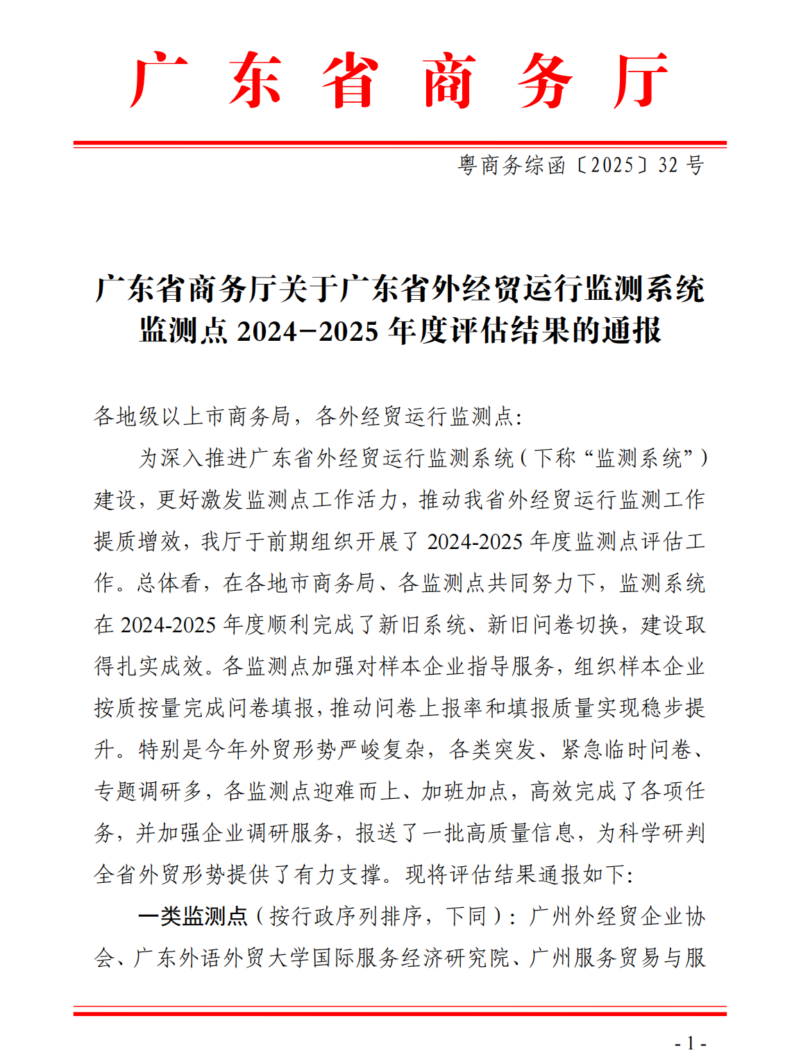 2025年8月,依托伟德国际betvlctor1946建设的国际服务经济研究院在2024-2025年度评估中再度被广东省商务厅评为“广东省外经贸运行监测系统一类监测点”。