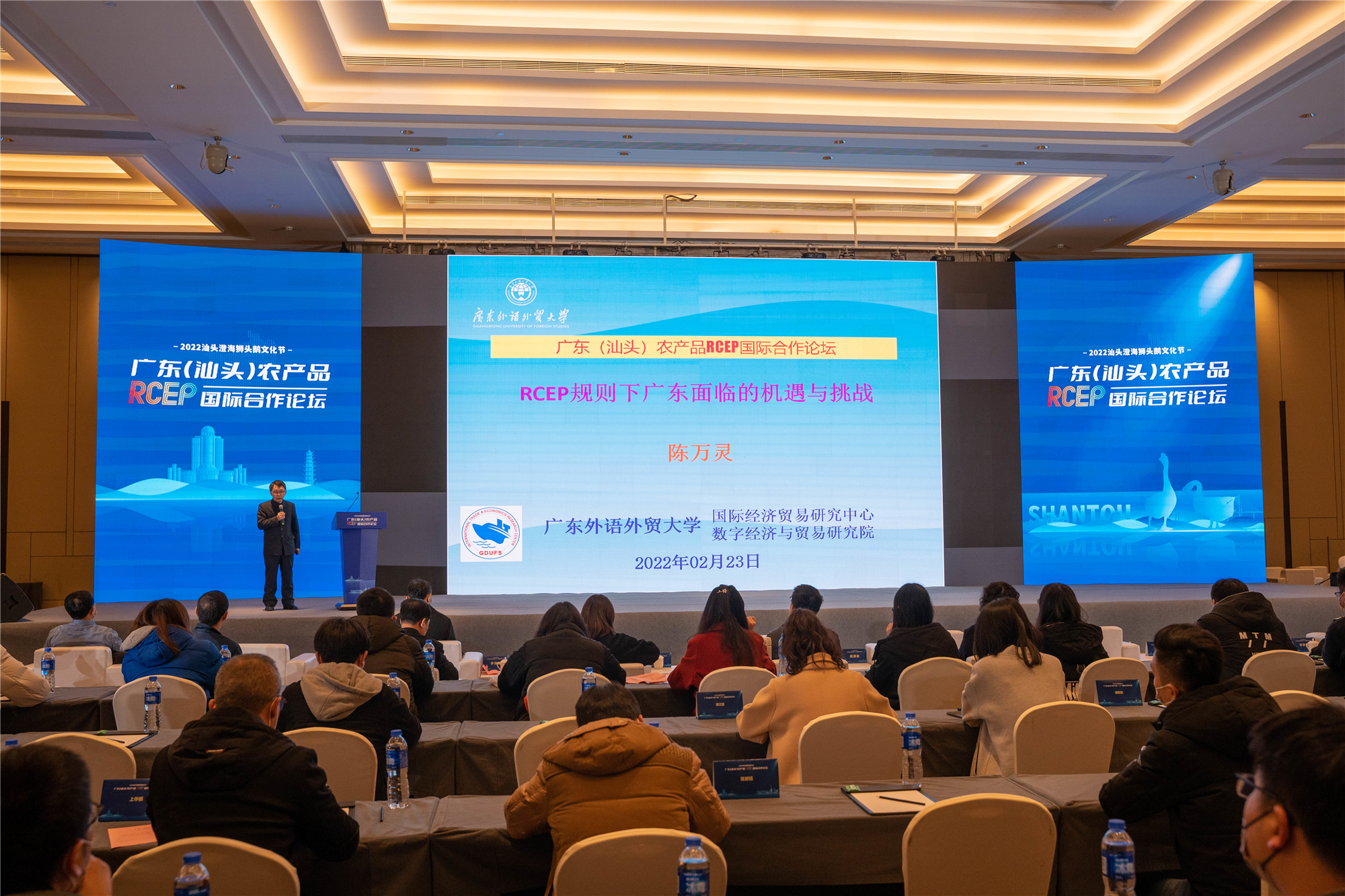 2022年2月23日,我中心专家陈万灵教授应邀出席广东(汕头)农产品RCEP国际合作论坛并做学术报告。广东(汕头)农产品RCEP国际合作论坛在汕头市澄海区举办。广东省农业农村厅有关处室领导、汕头市、澄海区相关领导、行业专家、企业家以及媒体代表等150多人出席论坛。论坛围绕如何促进汕头市农产品开拓RCEP成员国市场,持续推动农产品出口展开交流。陈万灵教授在主题报告环节首位发表主旨演讲,以题为《RCEP规则下广东面临的机遇与挑战》演讲,对区域全面经济伙伴关系(RCEP)内涵及特点、RCEP协议文本的内容进行了解读。在报告中,指出RCEP协议形成背景及意义,及其对贸易和经济发展的影响途径——关税减让条款,规则协调与互认条款、贸易便利化措施和投资协定条款,带来一系列效应,即降低贸易环节交易成本、减少政策不确定性、优化资源配置和模仿学习路径,最后促进贸易和经济发展。最后对广东开放型经济发展带来的机遇和挑战进行了分析,并结合广东农产品贸易情况,指出广东农业贸易发展机遇,农业发展的优势和挑战。提出的观点“RCEP的生效将放大广东农业的优势和劣势,广东农业产业链完善的优势将更为显现,但核心技术如种业等仍可能受制于人”引起与会者的激烈讨论。