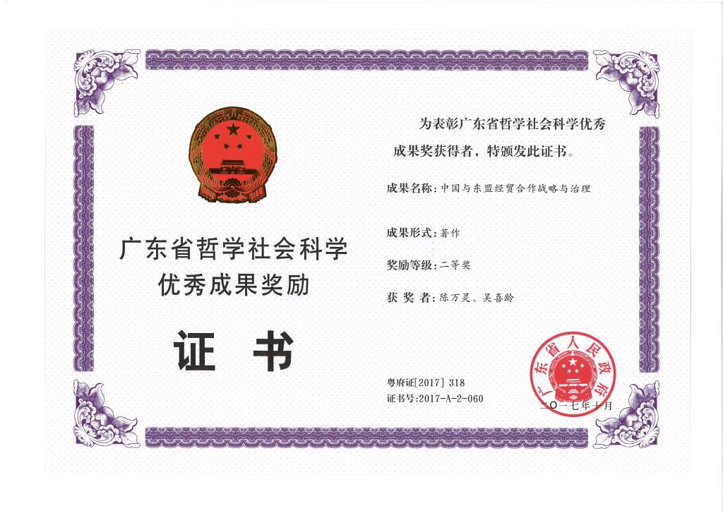 我中心陈万灵教授与合作者的学术著作《中国与东盟经贸合作战略与治理》获得广东省第七届哲学社会科学优秀成果奖二等奖,刘胜副教授与合作者的论文《Regional analysis of the impact of inwardforeign direct investment on economic growth in the Chinese electronic industry》获得广东省第七届哲学社会科学优秀成果奖二等奖。2017年12月5日参加广东省第七届哲学社会科学优秀成果颁奖大会,获受奖励证书。