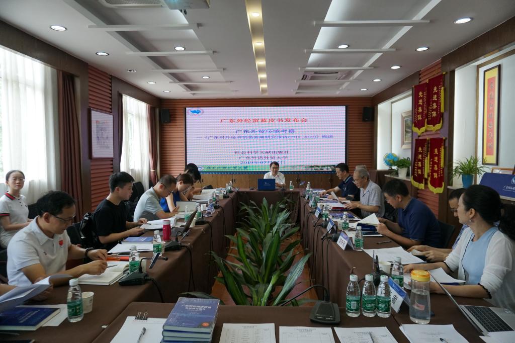 2019年7月13日上午,在伟德国际betvlctor1946广东国际战略研究院会议室,我中心主编的《广东外经贸蓝皮书·广东对外经济贸易发展研究报告(2018~2019)》举行发布会。出席发布会的专家有广东外语外贸大学肖鹞飞教授,广东外语外贸大学经济贸易学院李未无教授,广东外语外贸大学高等教育研究中心主任陈万灵教授,我中心主任刘继森教授以及副主任刘胜副教授;与会人员还有来自中国新闻社、中国社会科学报、中国经济导报、中国经营报、中国企业报、香港商报广东新闻中心、21世纪经济报道、信息时报、南方日报等媒体的领导和记者;同时,蓝皮书部分作者参加了发布会。发布会由我中心主任刘继森教授主持。